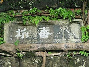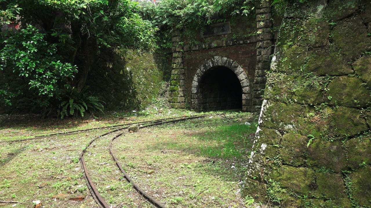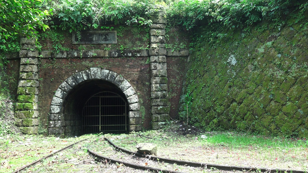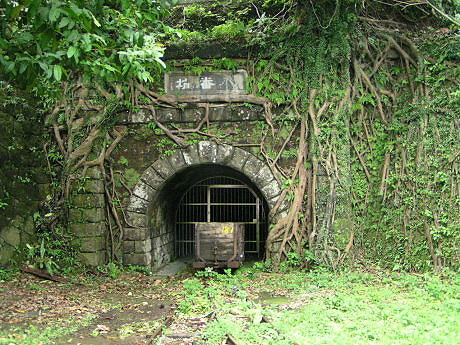 礦坑口的石匾刻著「八番坑」,落款處寫著「明治三十三年開」。