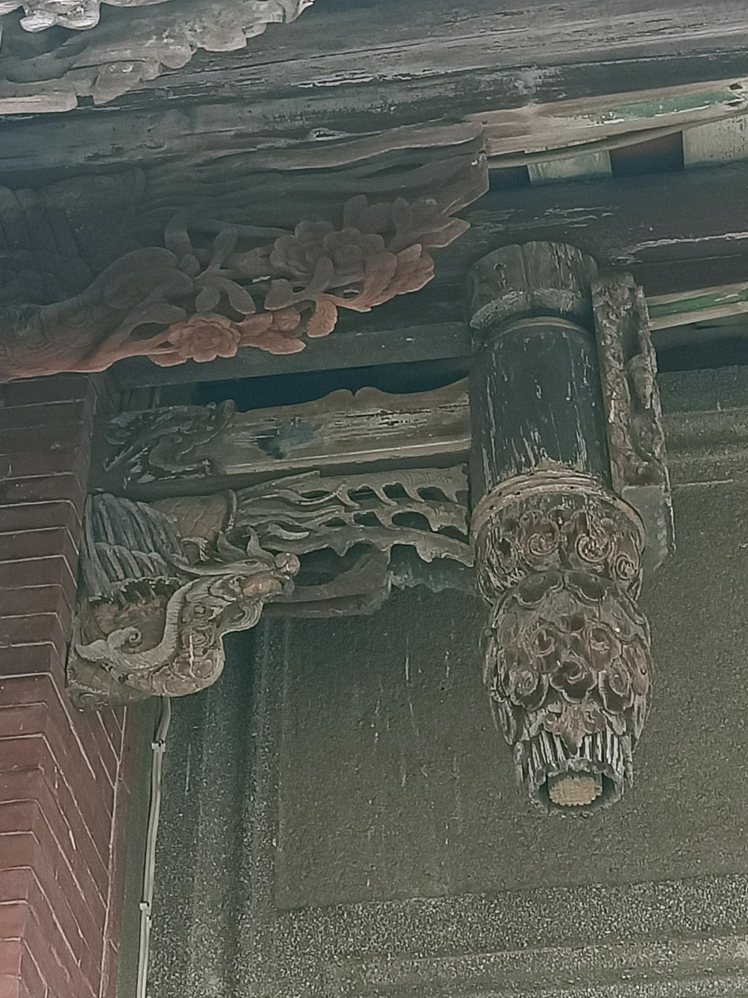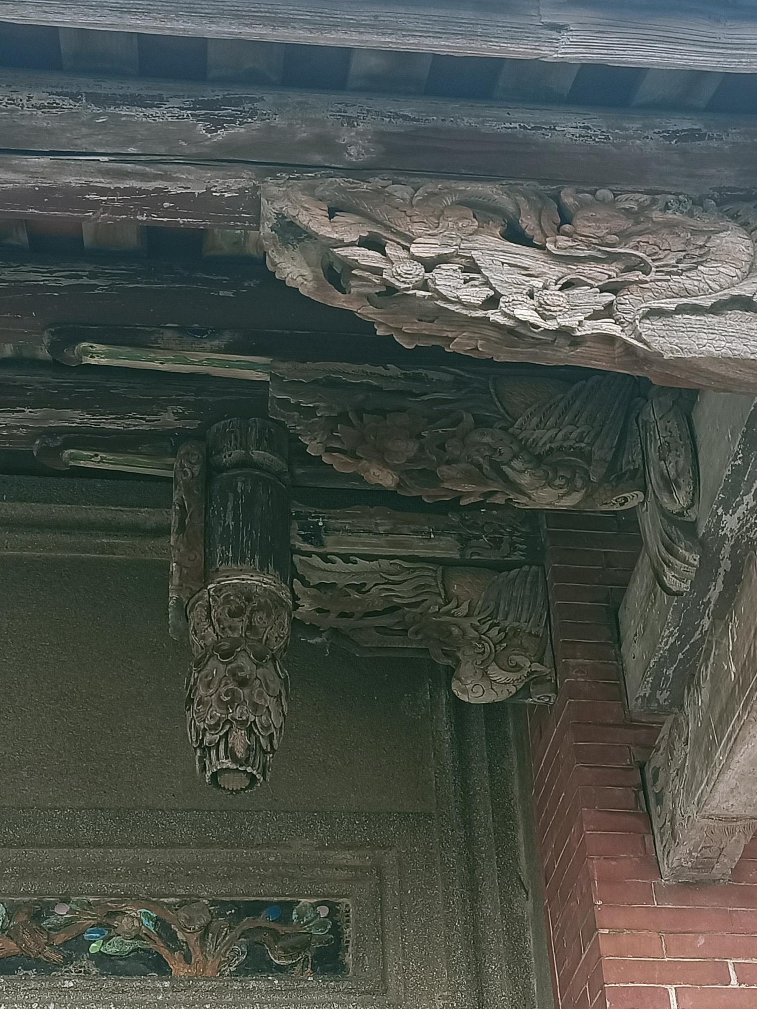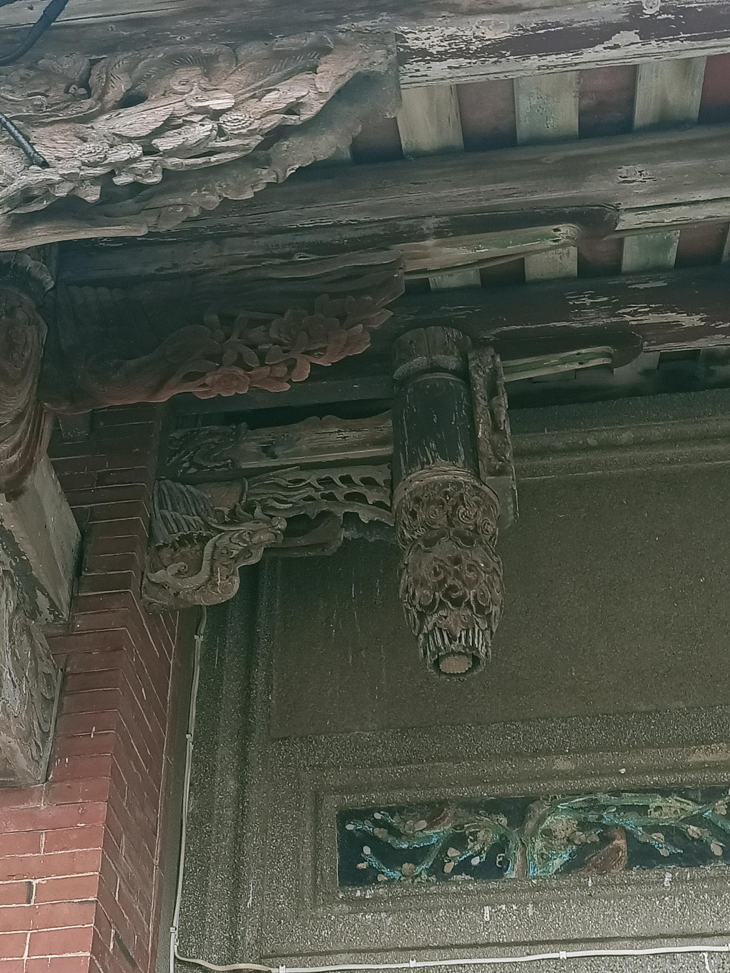 內埕屋簷仍保留有鰲魚剪黏落水口。