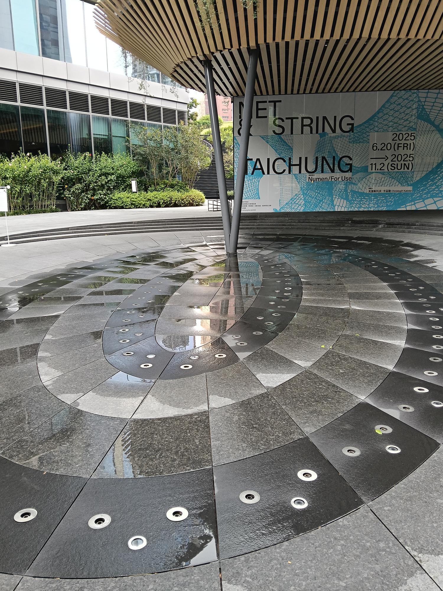 由外而內,圈起建築及四周彎曲林徑、戲水池等互動動線,