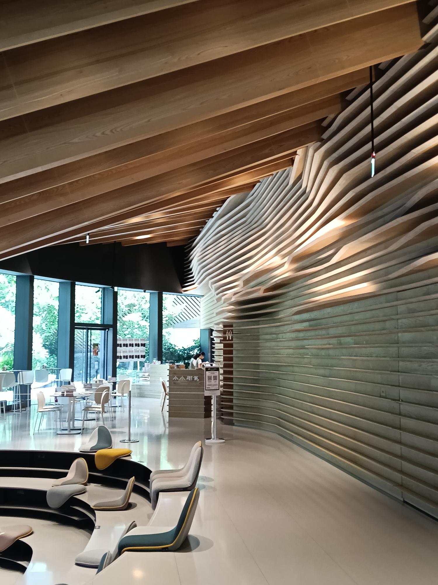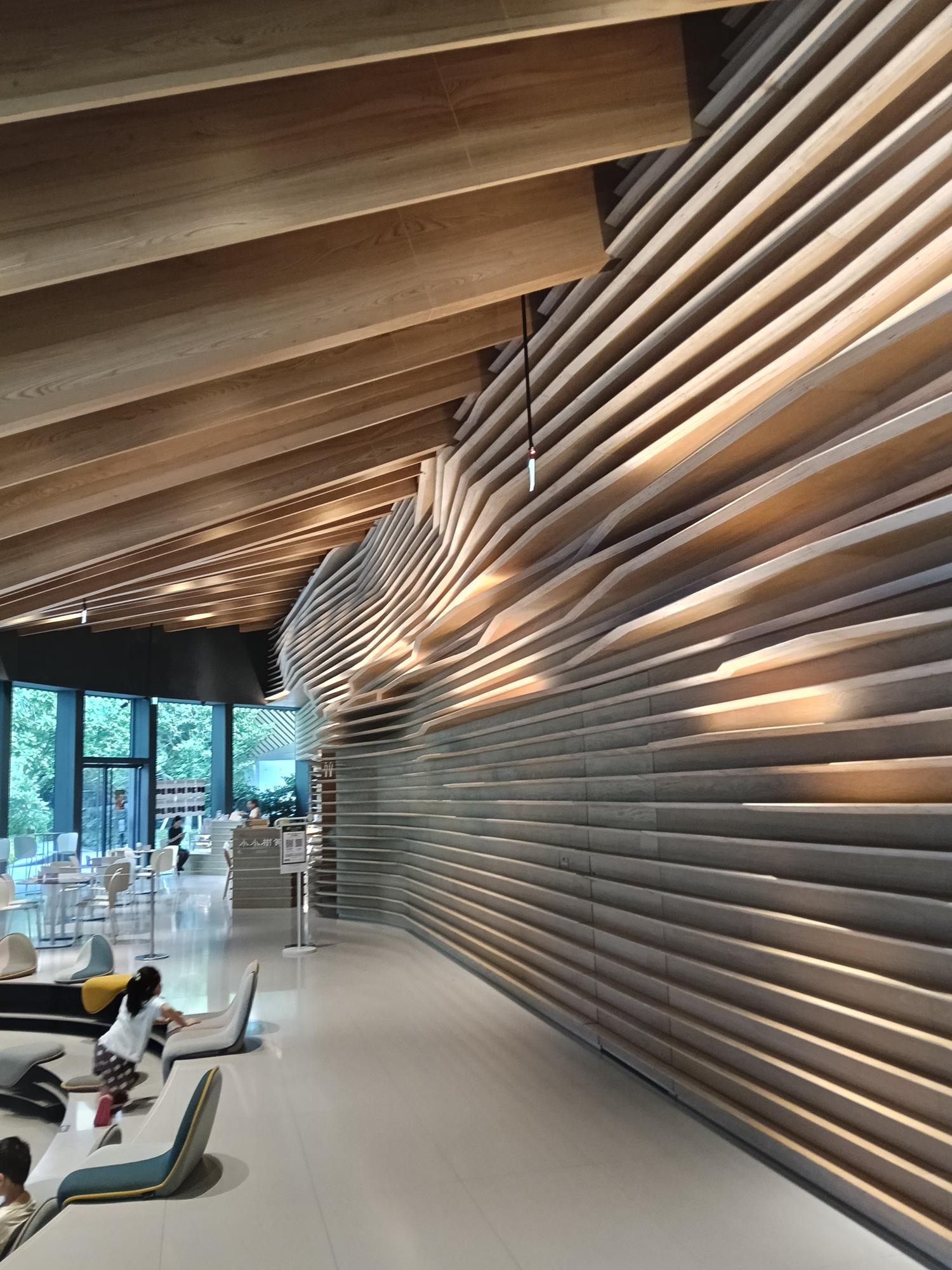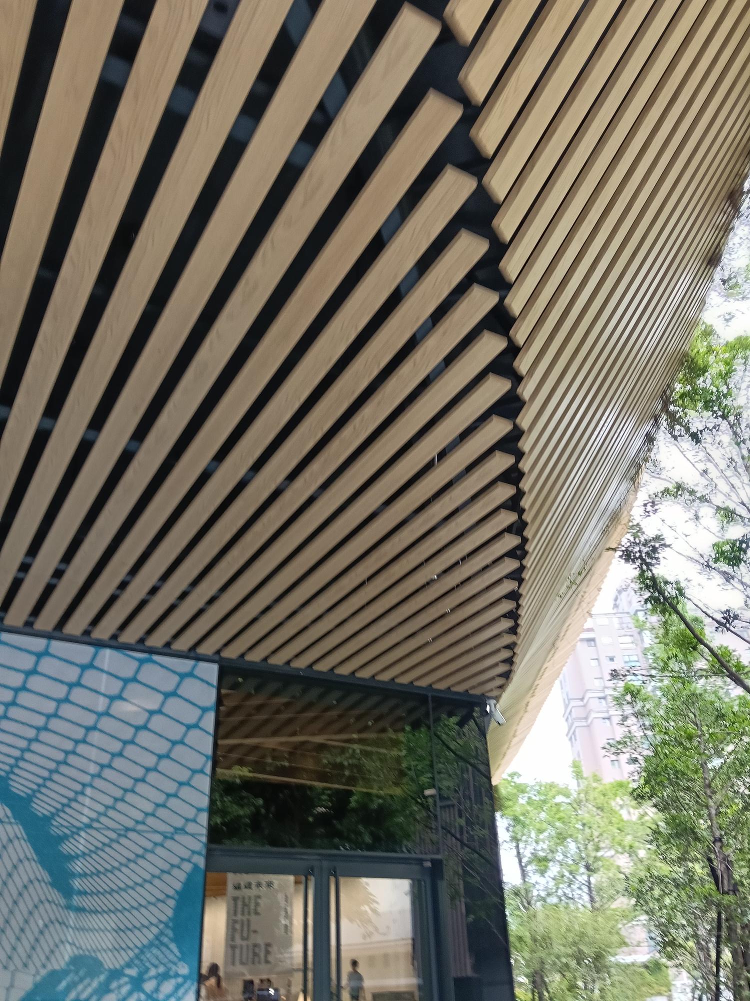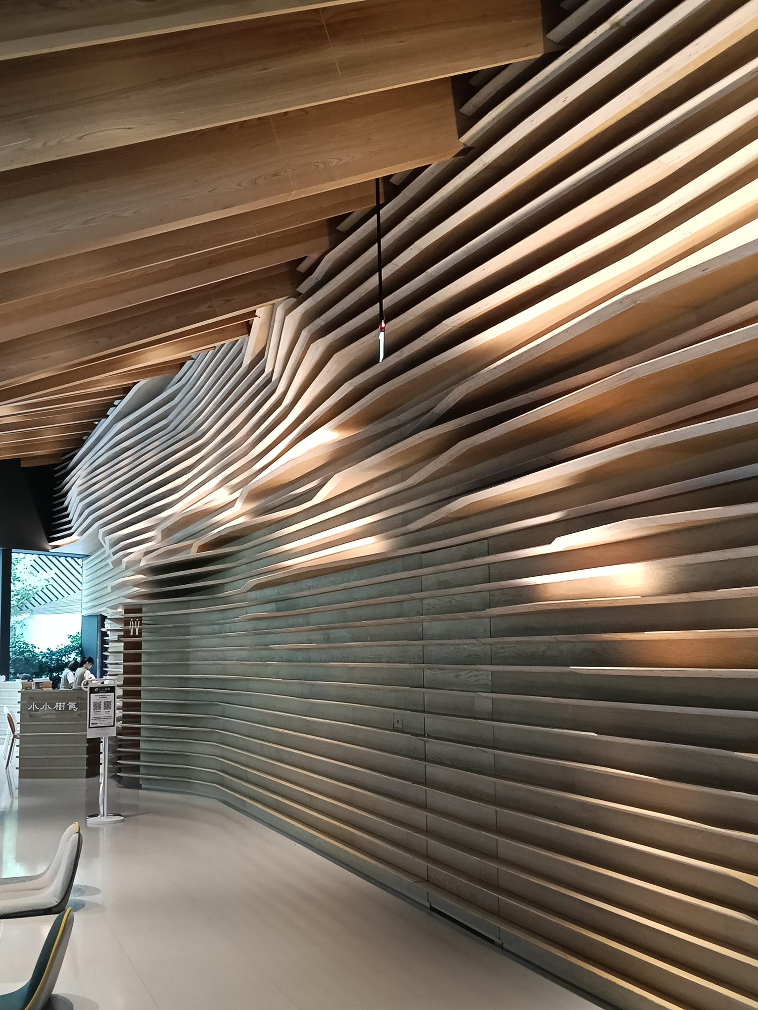 有趣的是,隈研吾建築團隊運用木質格柵及岩板牆、