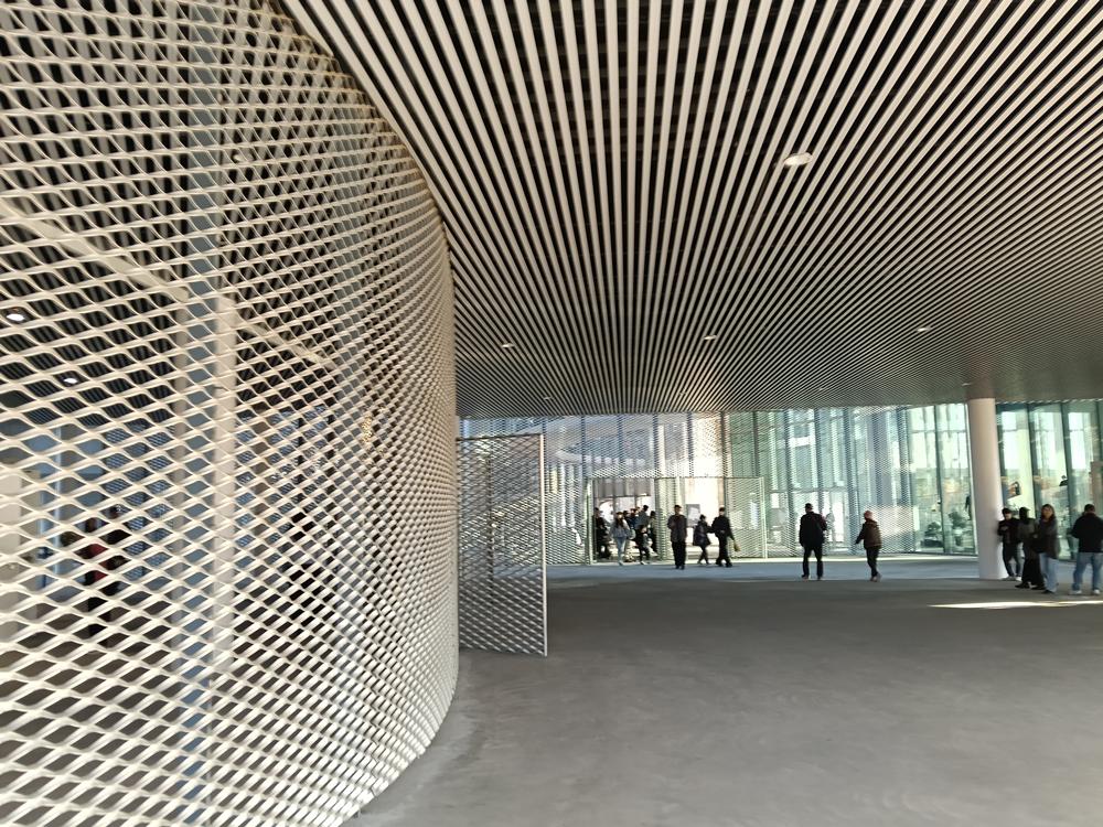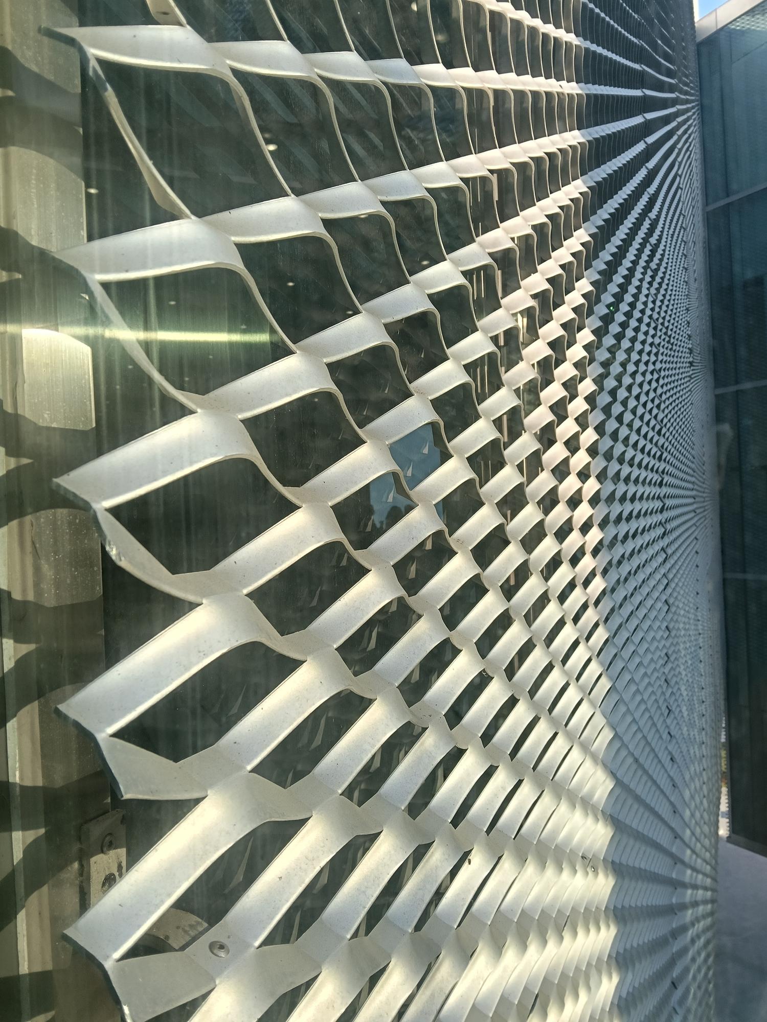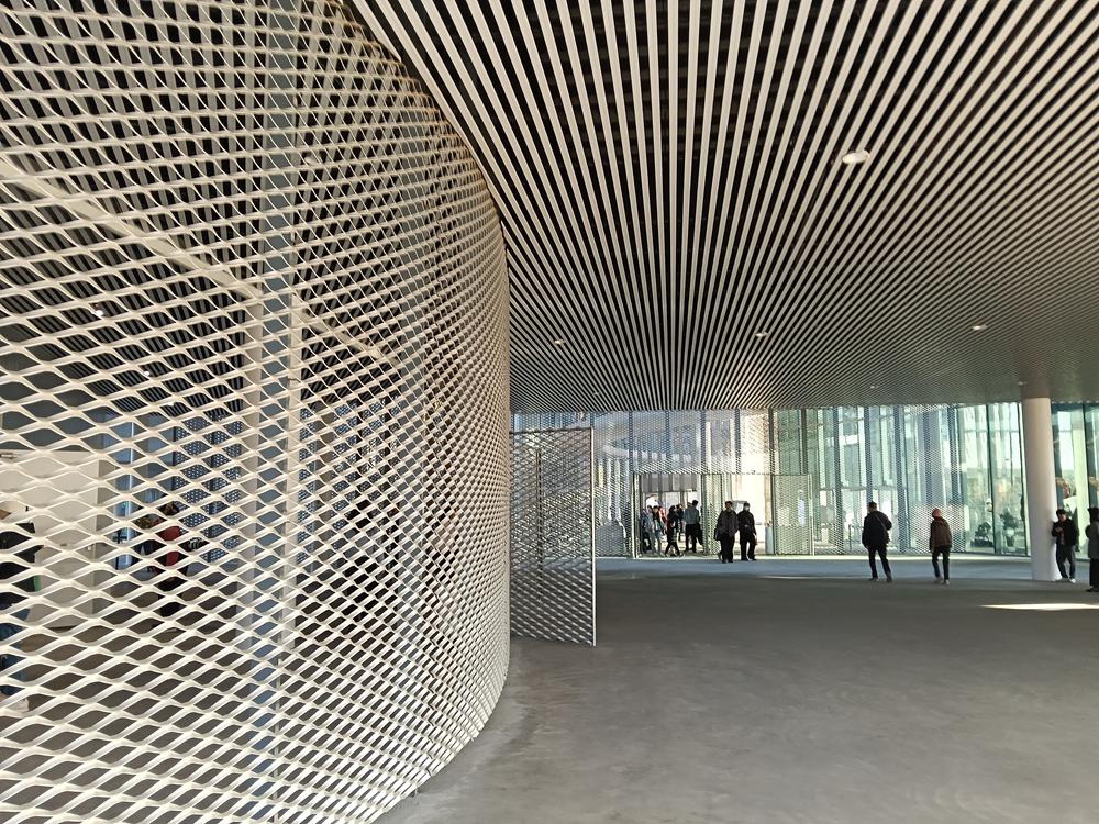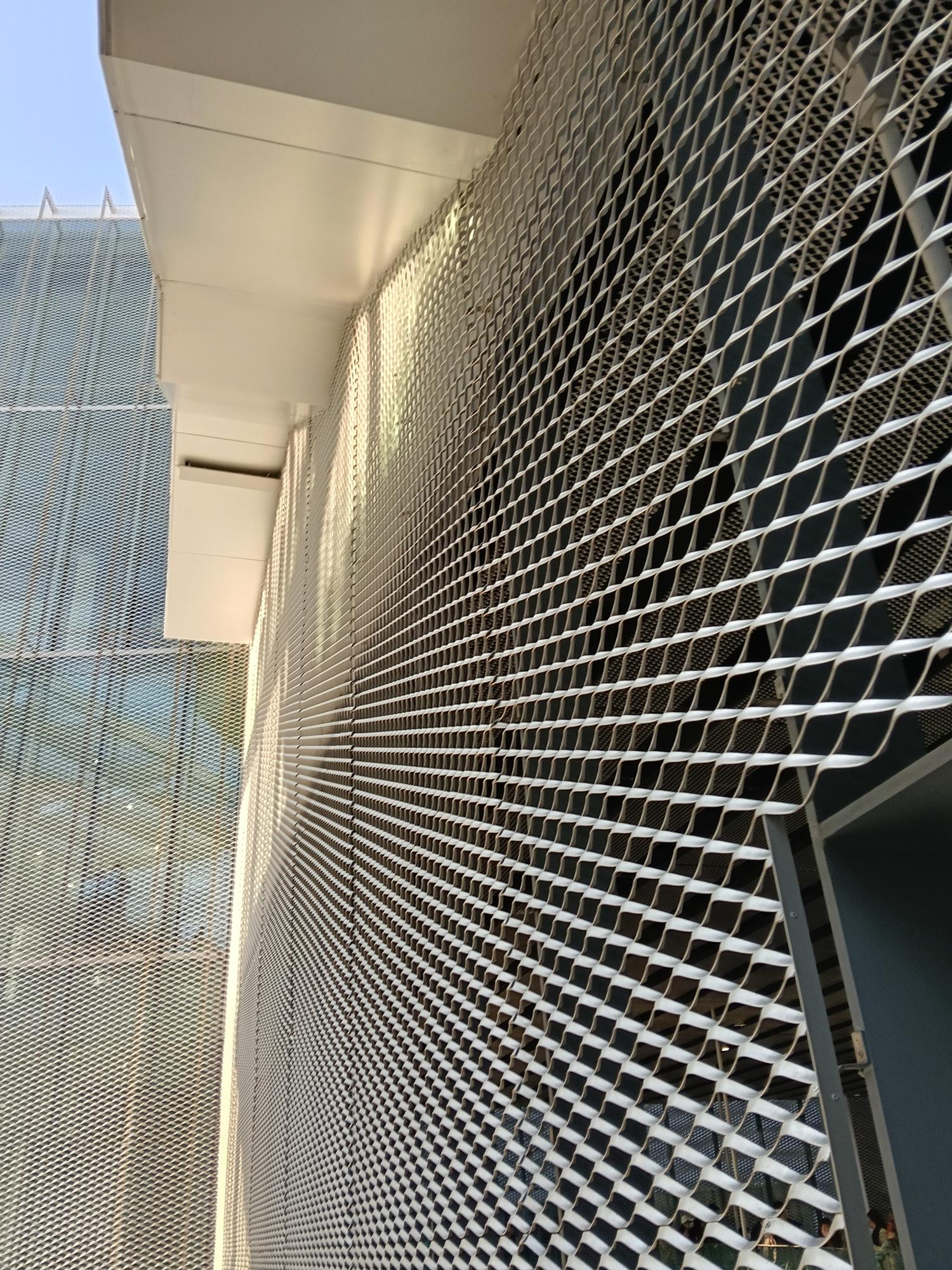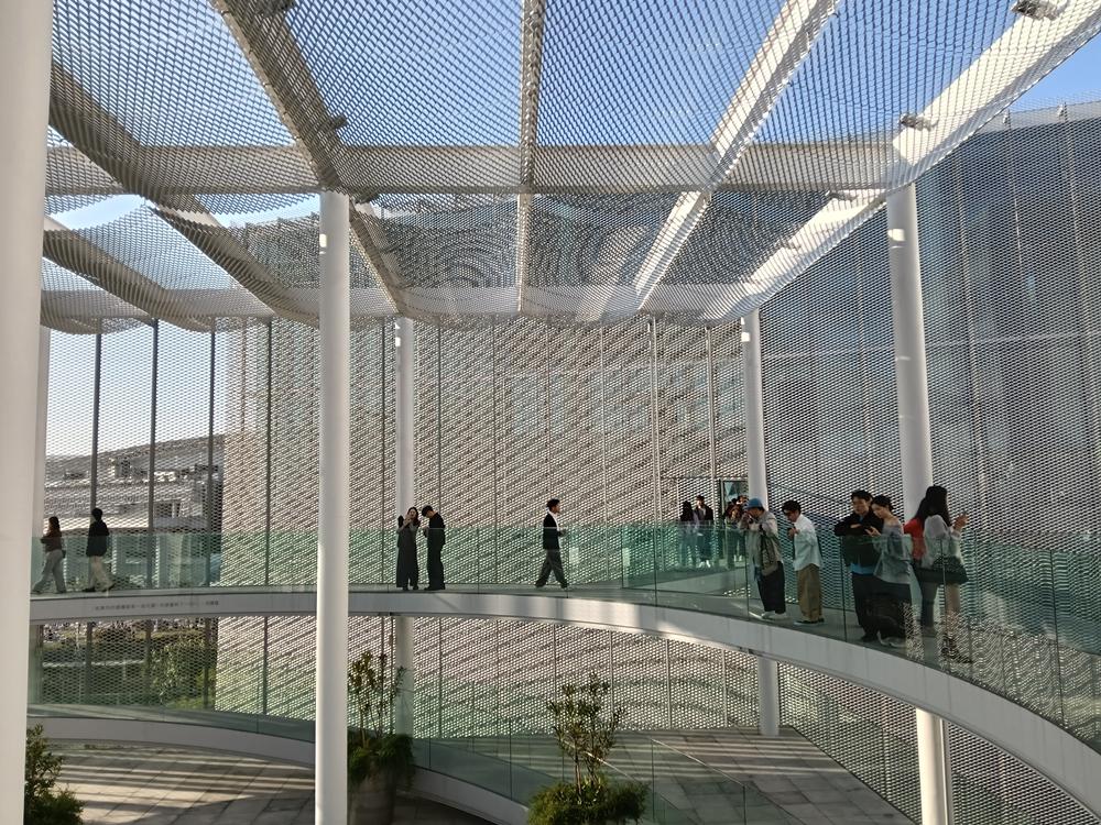再以銀白鋁製擴張網覆蓋,宛如輕盈的薄紗映照周邊景致,