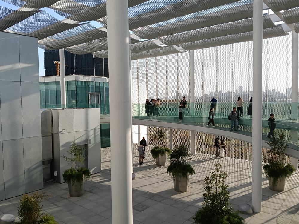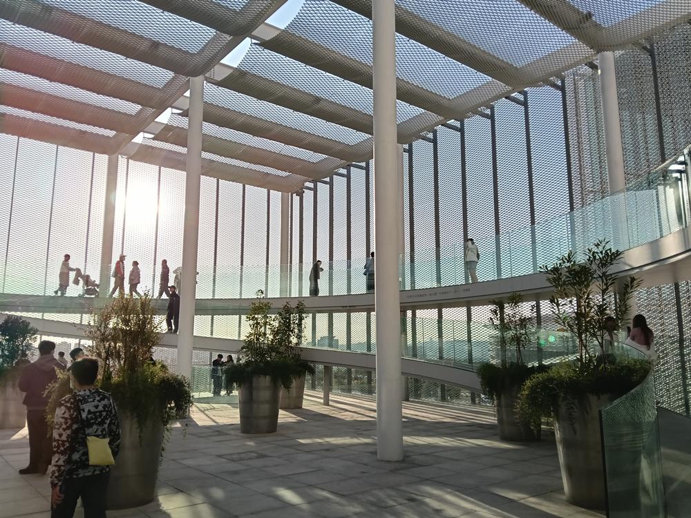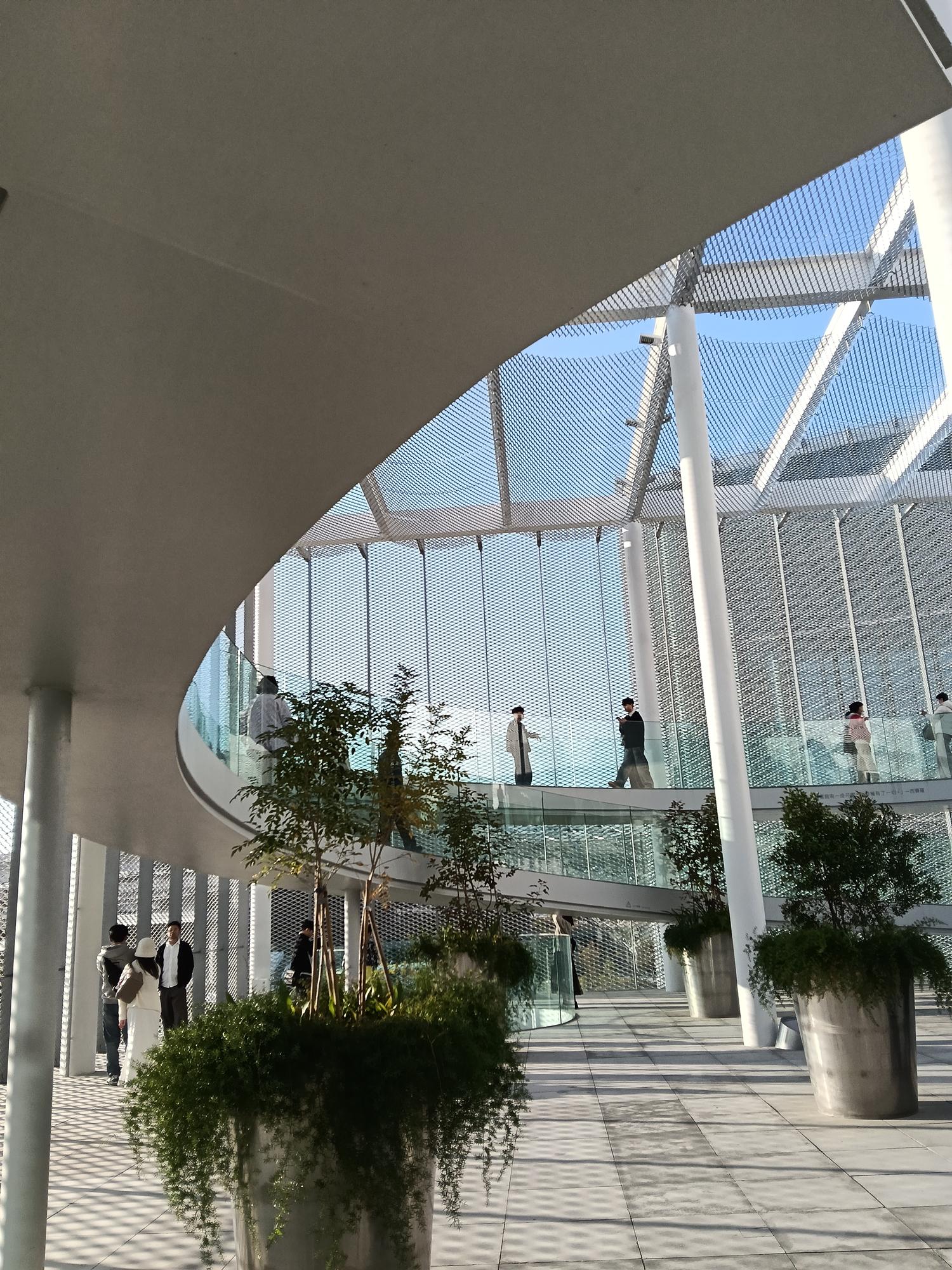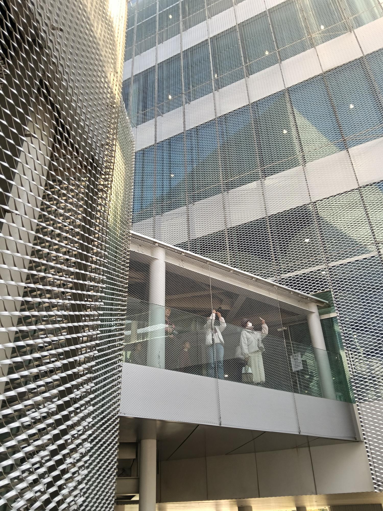再以銀白鋁製擴張網覆蓋,宛如輕盈的薄紗映照周邊景致,