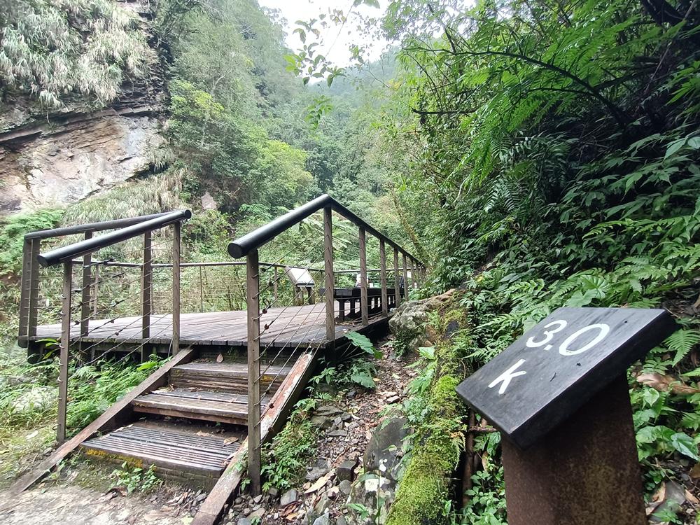 步道入口幽靜隱蔽,木棧道沿溪谷左側山壁蜿蜒延伸,