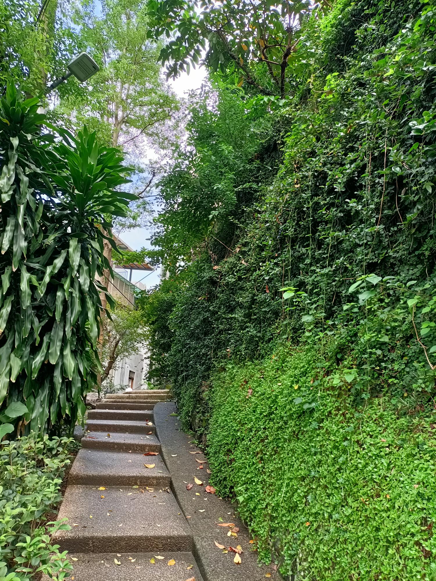 周邊綠蔭環繞,旁邊空地之中石牌,