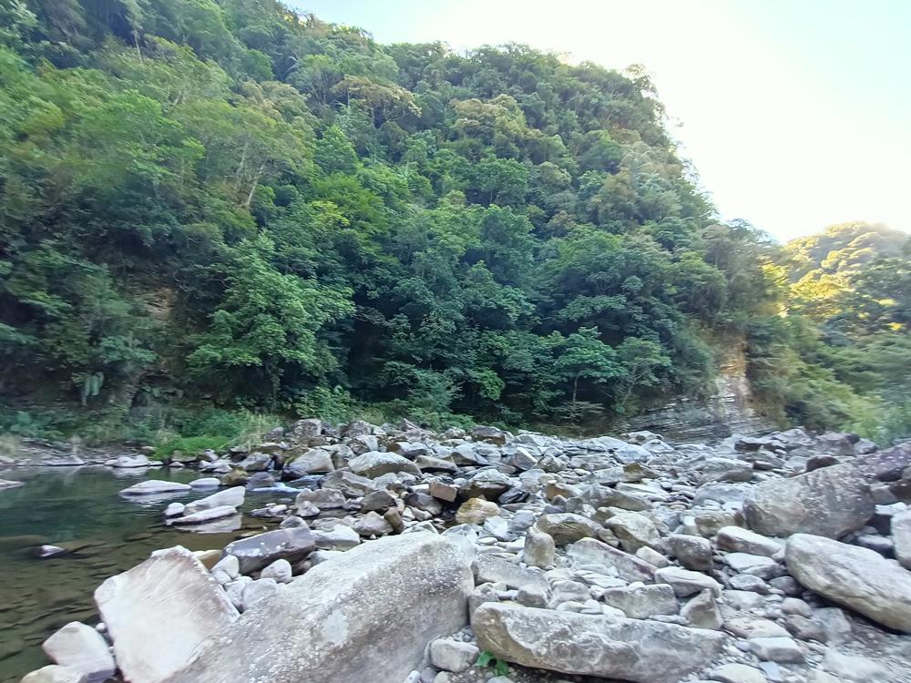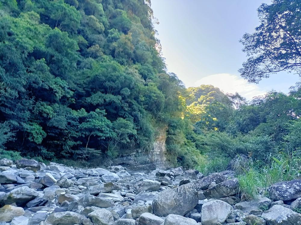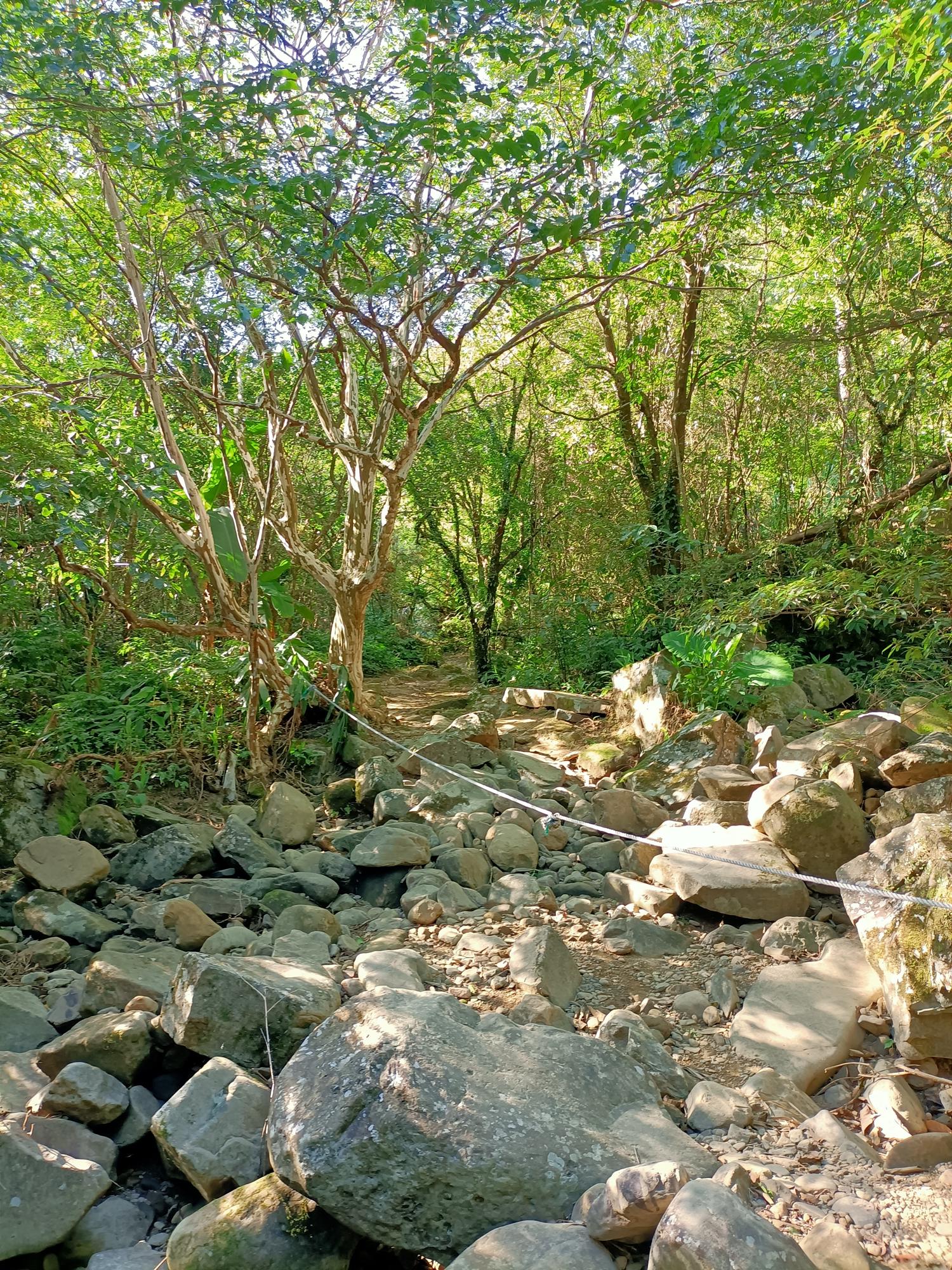 沿著溪岸邊的土石產業道路, 續行約五、六百公尺,抵達三水潭前