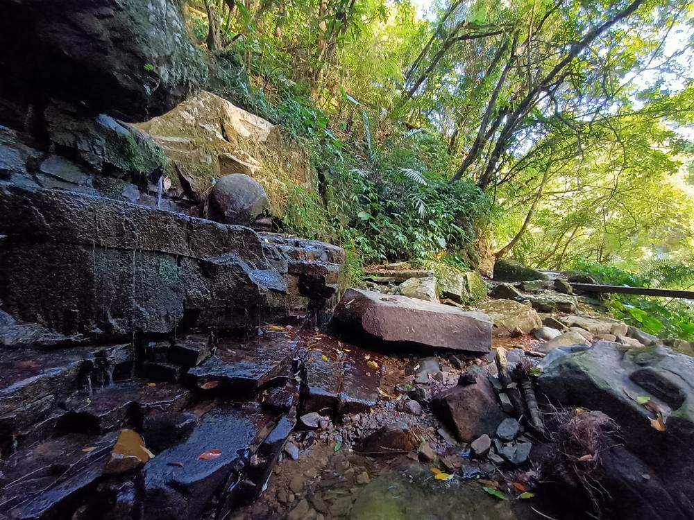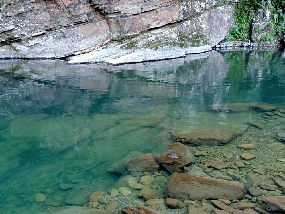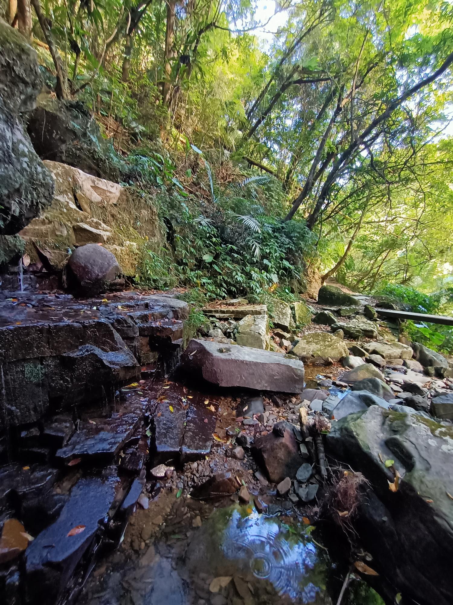 再沿著古道石階向上爬行至「夢潭」,潭水顏色碧綠,