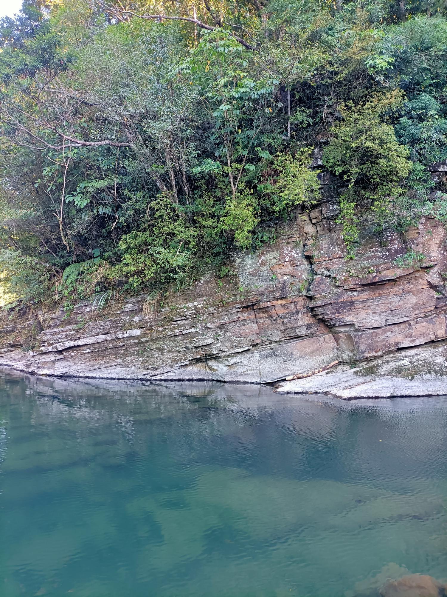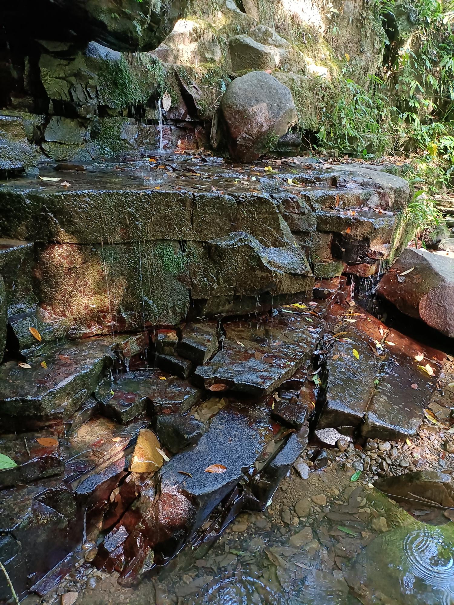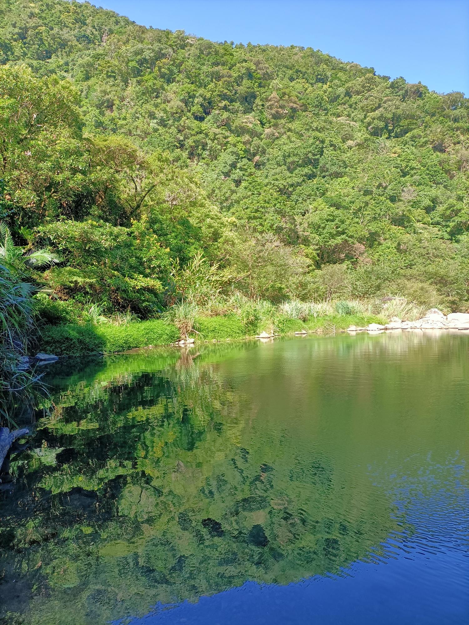 再沿著古道石階向上爬行至「夢潭」,潭水顏色碧綠,