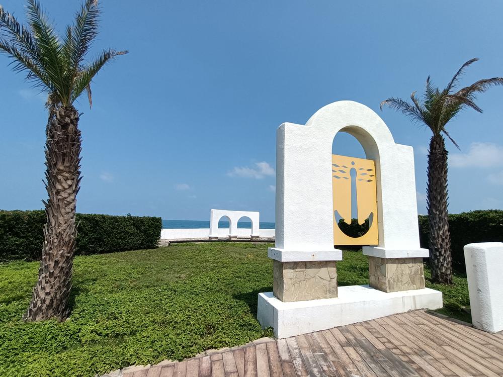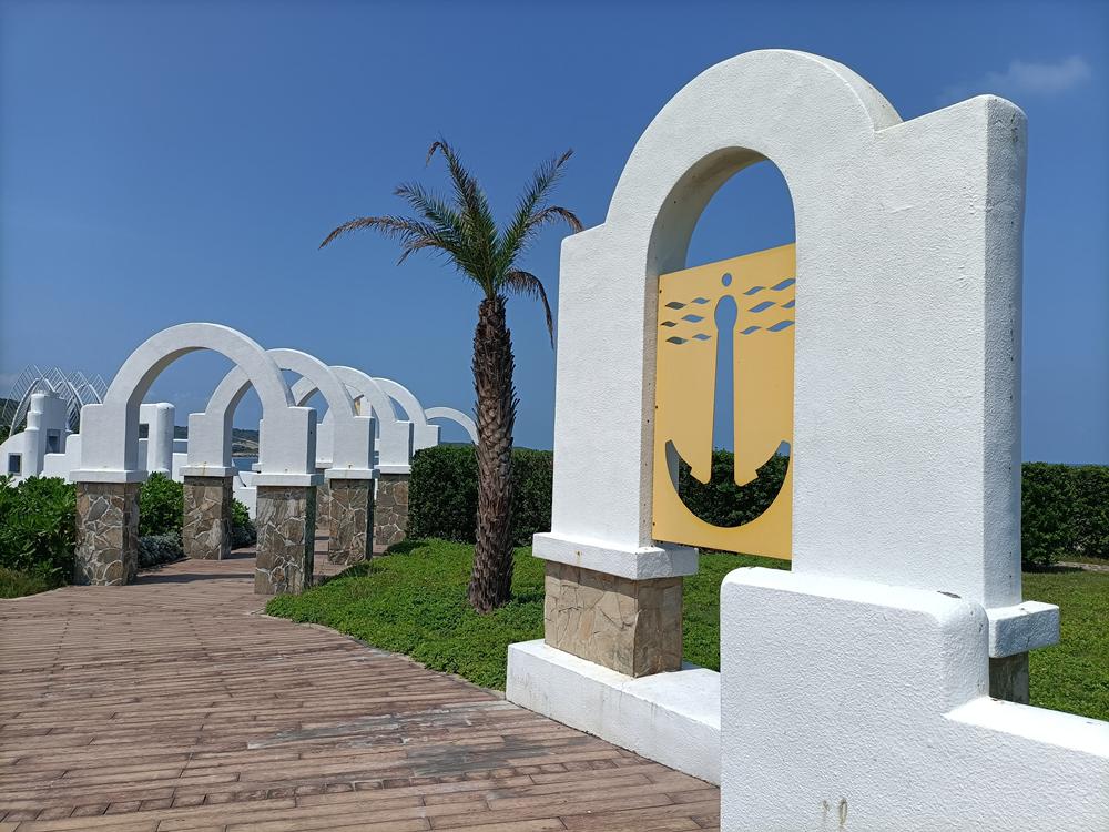 提供遊客拍照使用;廣場面向大海,一片希臘概念的鐘樓