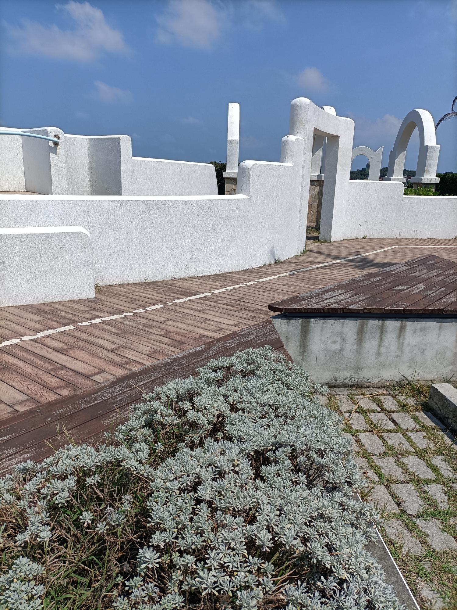 牆面、希臘柱子、花架拱廊及藍白色調,呈現濃郁的希臘風情,