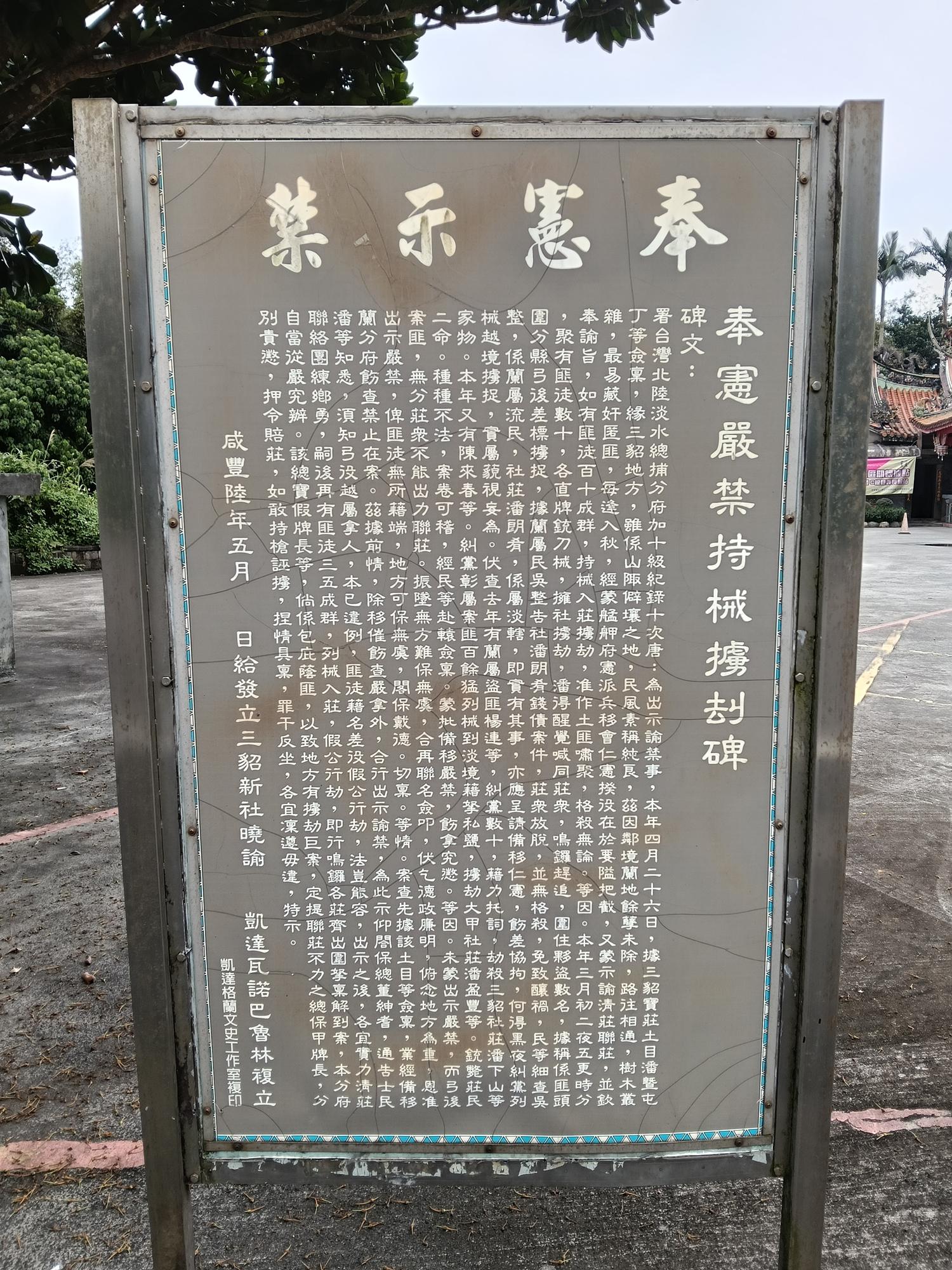奉獻示禁碑立於咸豐6年,為三貂保莊一帶,為防蘭屬盜匪持械